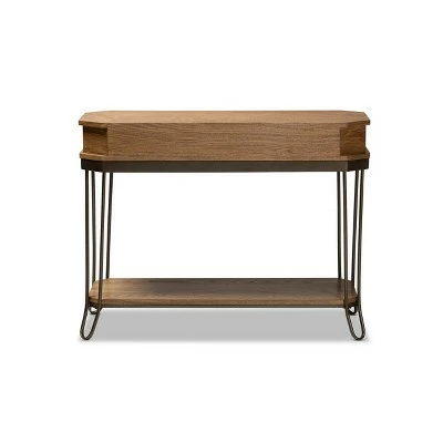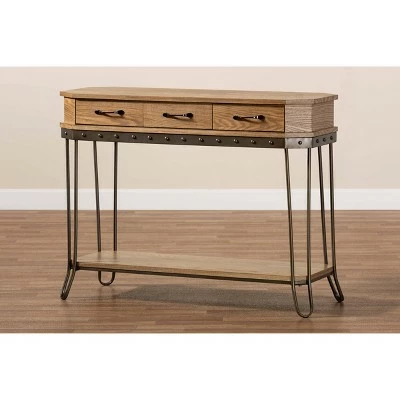Add eye catching vintage charm to your home with the stunning Kellyn console table. Made in China, the Kellyn is constructed from black finished metal and oak brown finished wood for a unique, rustic look. Three drawers, fitted with black metal handles, provide valuable storage for keys, mail, and other items. Round studs add a cool industrial touch, while hairpin legs lend a light, airy appearance. Requiring assembly, the Kellyn is equipped with a lower shelf for displaying decorations. Organize your entryway or hallway with the aged aesthetic of the Kellyn console table.