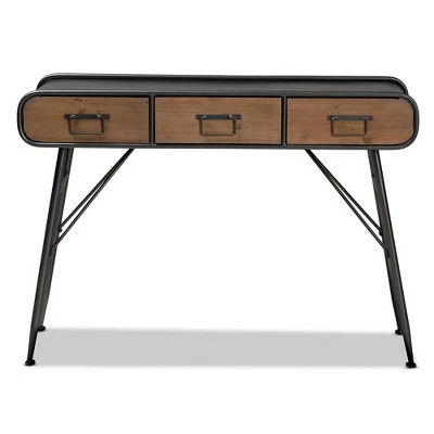Add an artistic charm to your entryway with the Santo console table. Made in China, this piece contains three drawers to provide ample storage space for keys, mail, or supplies. A rounded frame and smooth angles give the Santo a chic look that helps it stand out in busy areas. This piece requires assembly and is supported by thin, angled legs that fit well in tight spaces and allow for additional storage space underneath. Oak brown finished wood drawer fronts, adorned with square handles, give the Santo an industrial charm that adds personality to any entrance. Dimensions: 31.9″ high x 45.7″ wide x 15.9″ deep; Drawer dimensions: 5.5″ high x 14.4″ wide x 14.8″ deep; Legs: 26″ high;