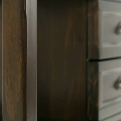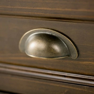 - Transitional design includes rounded molded table top, framed drawers, square and slightly tapered legs and Antique Bronze classic drawer pulls