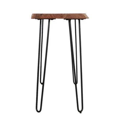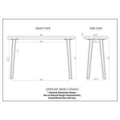 Mid-century meets Modern Industrial with these Natural Live Edge table tops and hairpin metal legs. Each tabletop is unique; no two tops will be exactly alike. Constructed of natural acacia wood. Each of our live edge products includes nylon floor protectors. The knots and cracks add to the wood’s character. A clear natural finish enhances the beautiful features in each piece of wood. The Media/Console Table will keep all your electronic devices organized and clutter free. Perfect for organization and to showcase your beautiful television.