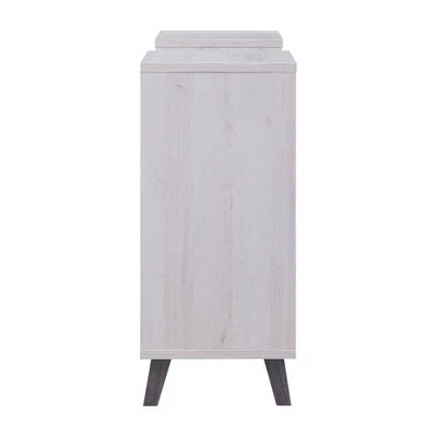 Sleek design with angular legs for sculptural inspired design balanced, this sideboard presents your everyday space with ample storage. Constructed of Particle Board and MDF materials for sturdiness, the sideboard features six shelves for handy storage to stash knick-knacks in your living or dining area. 2-tone finishes offer a sleek and modern aesthetic in your space.