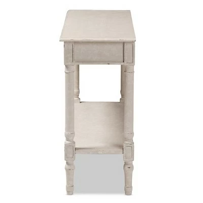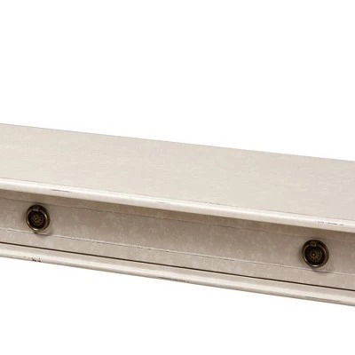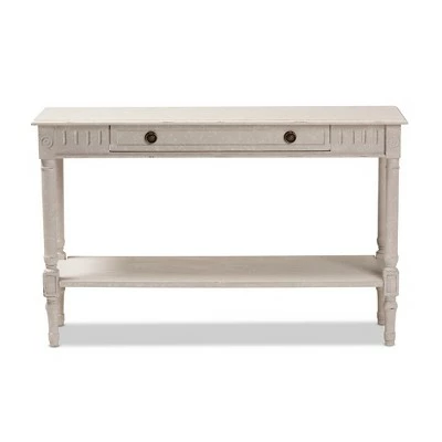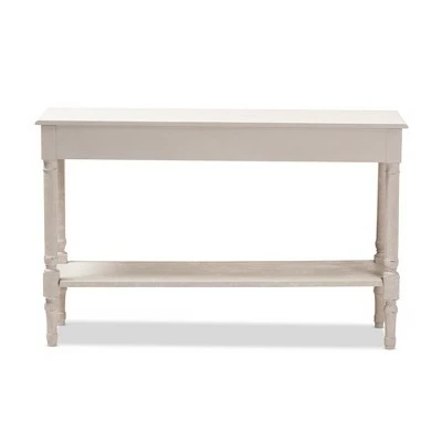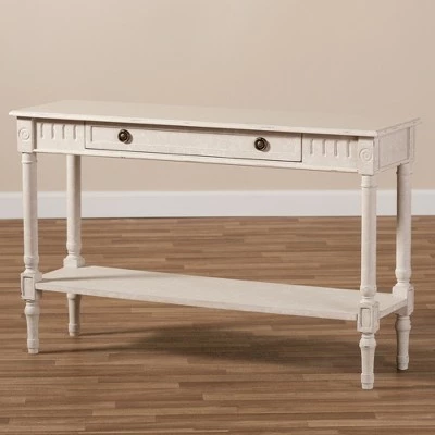 The ornate ball-turned details and the weathered look of the Ariella Whitewashed 1 Drawer Console Table White from Baxton Studio will add an element of romance and bygone times to your home. The country cottage farmhouse-inspired design is evident in the amount of detail put into this console table. The whitewashed finish of the piece and charming, bronze finished drawer pulls give the console table a bit of antique style.