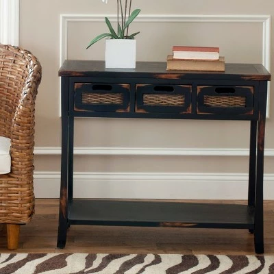 You’ll fall for the Autumn Console not only for the plentiful storage, with three drawers and a bottom shelf, but also for its subtle fusion of design details. This vintage inspired pine console with distressed black finish and basket woven drawer fronts stands atop understated curved legs for a touch of added intrigue.