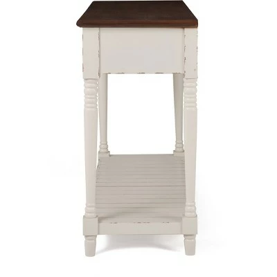 This compact but versatile console table is a convenient addition to any entranceway or hallway. Two drawers and a lower slatted shelf offer plenty of storage solutions. The modern farmhouse style is an attractive addition to any decor, from traditional to contemporary. Available in a stylish antique white finish and dark wood table top that’s certain to impress. Featuring charming turned wood legs to soften the look of your furnishings.