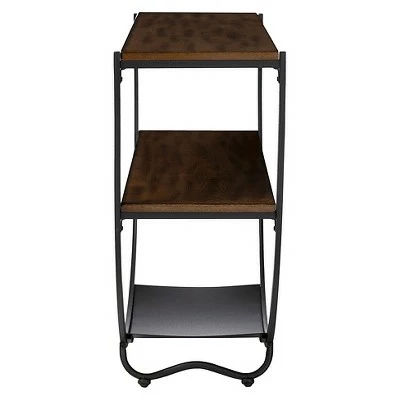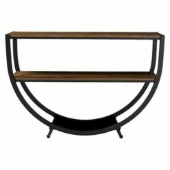 Featuring a rustic reclaimed look, the Blakes console table is constructed of antique black textured finish metal frame and distressed weathered oak finished plank wood board. The U-shaped base of console table is perfect for entryway to hold everyday belongings and cut the clutter in your home. The distressed finish over oak veneer adds vintage casual style for a unique accent console table in a living room, entry way, or dining room. The Blakes will be a standout piece for any home looking to add a touch of refined style. Made in China, the Blakes console table requires assembly. Dimensions: 34″ High x 50″ Wide x 15″ Long; Shelves (Upper): 47″ Wide x 14″ Long; (Middle): 12.2″ High(Between Selves) x 47″ Wide x 14″ Long