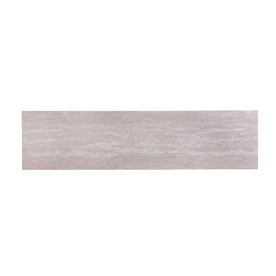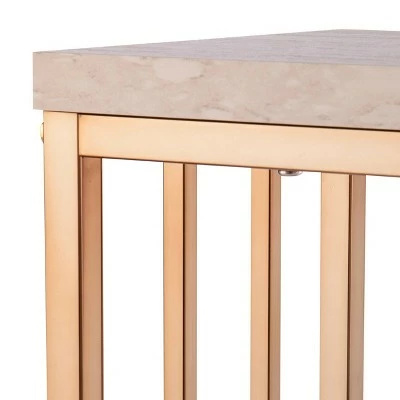 Raise your glass to the Aiden Lane Brampton Faux Stone Console Table. A lifelike, simulated travertine top complements a champagne-finished metal frame, adding a pop of pizazz to your living area. The open display shelf provides endless décor opportunities, while the spacious top houses table lamps and art books. Slide this statement making sofa table into your living room for stylish storage, or place in your entryway for a functional display that wows.
