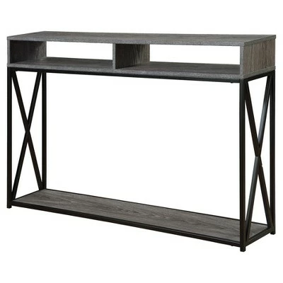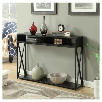 Add display levels and visual interest to just about any wall in your home with the Tucson Deluxe 2-Tier Console Table from Convenience Concepts. The ultra-slim nine-inch table design lets you place it in hallways or smaller rooms without monopolizing space or sacrificing display capability. The reinforced shelf design and central support divider is engineered to comfortably hold a wide variety of home decor essentials — floral arrangements, photographs, small book collections and anything else you can imagine.