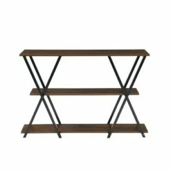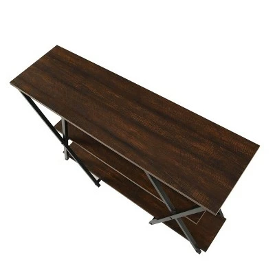 The Dowell console features sleek, clean lines in powder coated metal and Elm stained wood top. A rustic finish that underscores the industrial style. Featuring open x-shaped legs and 3 tiers for extra storage, this stylish console table is the perfect item to display in your living room, kitchen, or entryway.
