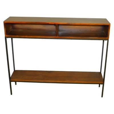 The Halsey Console is Perfect for a large or small spaces great for the entry way or behind the couch.. It boasts a slim cubby to stash mail, keys, gloves, photos or whatever else you want to keep handy. The lower shelf allows for even more storage space. Finely Constructed of Solid Mango Wood and hand crafted Steel Frame.