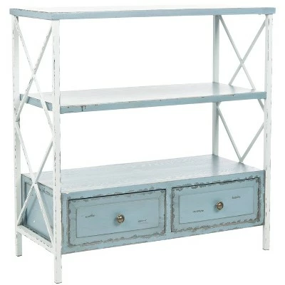 Romantics will fall for the feminine wiles of the Chandra console by Safavieh. Brimming with vintage charm, this piece is crafted with a distressed finish on its white iron X-frame contrasting its oak-finished shelves and drawers of Pine and Elm wood with NC Coating finish. Pretty and functional Chandra is ideal for coastal or country interiors. This storage table can hold up to 50 lbs. The Chandra console table is a great choice for Country, Shabby or Transitional style interiors.