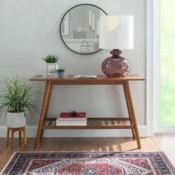 Add a touch of Mid-Century Modern style to your home with our Charlotte Console Table. The sleek lined design is finished in a rich, warm brown. A bottom shelf provides ample space for storage and display. The perfect addition to a living room or sitting area.