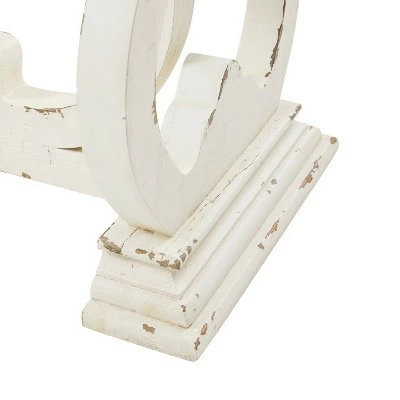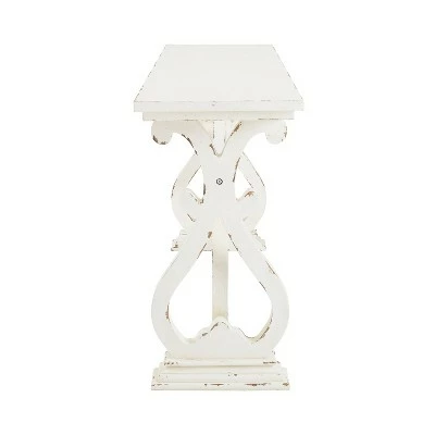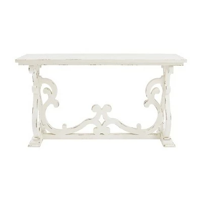 Brighten your home with this wood console table featuring decorative scrollwork and a distressed white finish. By blending traditional elements with a worn finish, this piece creates a look that is both elegant and inviting. For a cohesive effect, pair this piece with the matching side and coffee table and bask in the timeless charm they create.