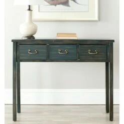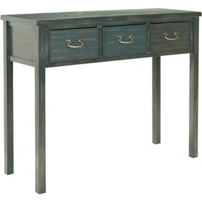The Cindy Console, with slightly tapered legs, dark teal finish, and three spacious drawers, has an easy going appeal. Perfect for country, coastal, or casual settings, Cindy is crafted from pine wood and abounds with French farmhouse charm. Care Instructions: Dust regularly with a soft, dry cloth. Never use oiled or treated cloths on lacquered finishes. Some finishes can be wiped with a damp (not wet) cloth, followed at once by rubbing with a dry cloth to remove fingerprints and smudges. For persistent spots, gently clean with a soft cloth and a solution of water and mild soap, make sure to wipe dry. Use adhesive felt pads, coasters and placemats to protect your furniture.
