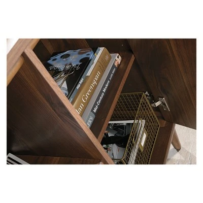 Bring a touch of elegant, mid-century inspired style to your home with this credenza from the Clifford Place collection. This beautiful credenza offers a spacious tabletop surface that provides you with room to display a stylish accent lamp, a decorative clock, and photos of family and friends. Switch it up and use as a TV stand! It accommodates up to a 46″ TV, making it perfect for binge watching all your favorite shows. Its large open shelf provides you with the ideal amount of space to store and display movies, books, bins, and other home dĂ©cor. Behind the door is hidden storage that includes an adjustable shelf for all your additional storage needs. The lower file drawer opens and closes on smooth full extension slides and holds letter or legal size hanging files so you’ll always be organized! It also features cord pass-throughs to keep all your wires neat and out of the way. Finished on all sides in Grand Walnut and accented with solid wood feet and bold brass hardware, this stylish credenza will stand out in any room.