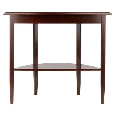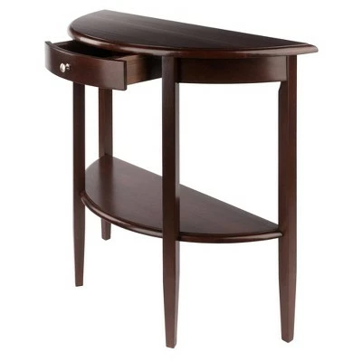 Bring style and functionality to your home decor with this Concord Console Table from Winsome. Featuring a half-moon tabletop and four tapered legs, this wood console table stands against nearly any wall in your home for a versatile furniture addition. The antique-walnut finish brings refined color to your existing decor, while the tabletop and built-in shelf offer plenty of space for storage and display. This antique-walnut console table is designed with a built-in drawer for added convenience, helping you keep track of anything from books to keys.