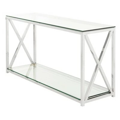 Sleek and chic, the Hayward Console brings two layers of transparent style to any room. Crafted with chrome and glass, modernism’s classic materials, its upscale X-Style detailing makes it an ideal addition to traditional or contemporary living room or entry hall. This simple decorative and reflective structure calls for elegance and simplicity. This stylish console table is able to support up to fifty pounds. The Hayward console table is the perfect addition for Contemporary, Modern or Transitional style décor.
