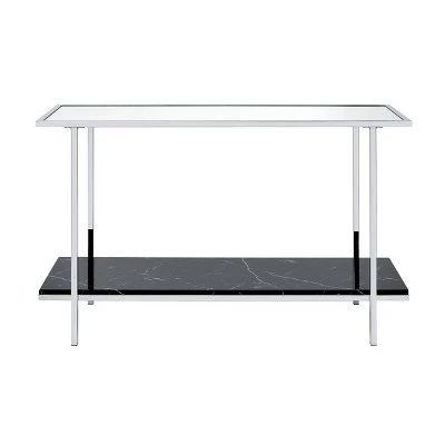 Magnify the beauty of your home with the inclusion of this well designed console table. It features a metal frame in silver finish enchasing a rectangular mirror tabletop and a rectangular open bottom shelf made from faux marble in black finish. It is supported on square metal legs for stability and strength.