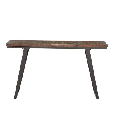 Textural, brown finish with matte black steel frames and legs and traditional carvings suit both classic contemporary and boho style spaces. Useful and elegant, console tables are more than just a place to throw your mail. Use it as an accent piece in the living room, library, bedroom, waiting areas, or hallways of you home. This item comes shipped in one carton. Traditional patterns carving complements classic contemporary and boho style spaces. Suitable for indoor use only. Made in Indonesia. Contemporary design