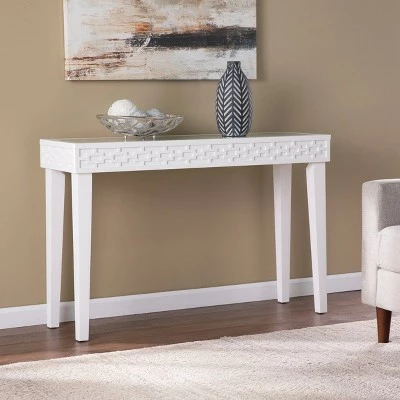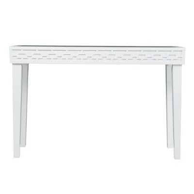 Refresh your home design with the Aiden Lane Denmit Glass-Top Console Table. Inset rattan adds a textured element to your décor, while the spacious glass tabletop displays your favorite books or collection of potted plants. Designed for small spaces, this narrow console table slides neatly behind your living room sofa or into your entryway. Elegantly blend function and style when you bring home this glass-top sofa table.