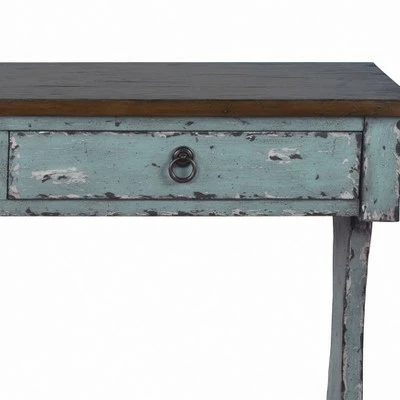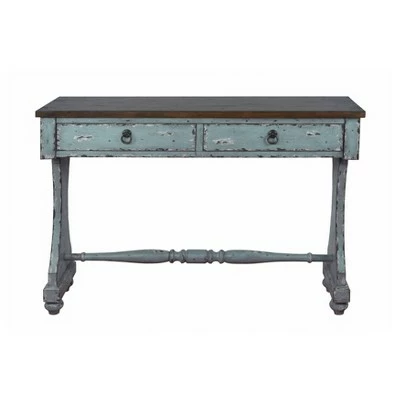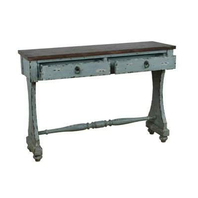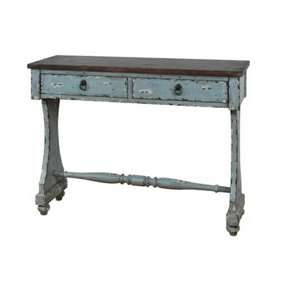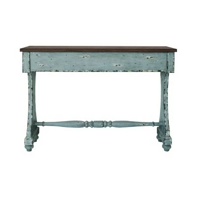 - A slender profile and weathered look make this charming console a perfect entryway piece