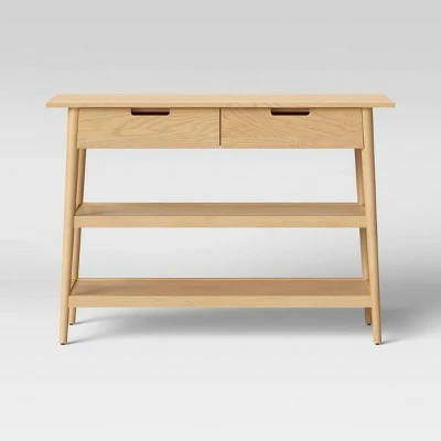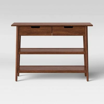 Turn any spare space in your home into a sleek decorative display with this Ellwood Mid-Century Modern Wood Console Table from Project 62™. Built from solid wood for durability, this console table brings mid-century charm and modern style to your space. The wooden console table comes with a smooth tabletop to showcase framed photos, potted plants and more, while two drawers and two open lower shelves are great for displaying your go-to reads or tucking away everyday items. Striking a clean-lined silhouette, this rectangular console table complements nearly any design aesthetic or color palette.