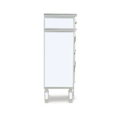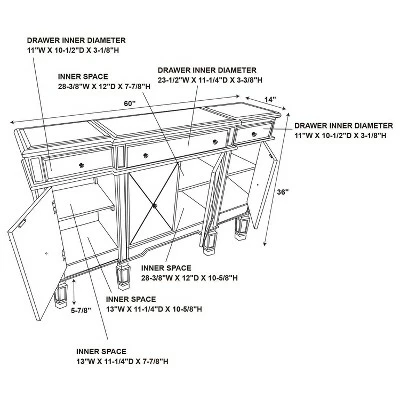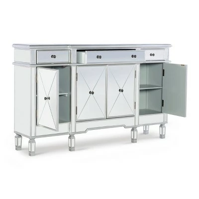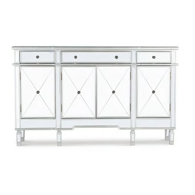 Glittering and refined, this console creates a glamorous look in any home with its classic lines accented with mirrors and a luxe silver finish. Add this piece to an opulent living room, sophisticated home office, or vintage master bedroom to enjoy ample storage in its three drawers and spacious lower cabinets. The versatile design enables this piece to serve as a sofa table, dining room buffet, or entertainment center.