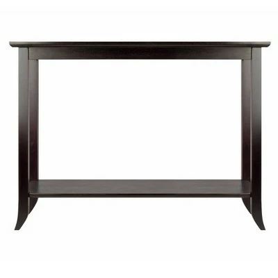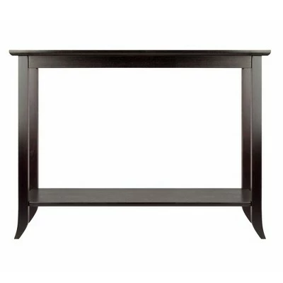 Add a stylish and practical touch to your space with the Genoa Glass-Top Console Table from Winsome. Standing on top of four sturdy flared legs, the wood-finish standalone table strikes a stylish silhouette. It features a sleek glass top set within a rectangular wood frame and has an open shelf on the bottom. Overall table size 40″W x 16.34″D x 30″H. Table top size is 40″W x 16.34″D, Tempered Glass size is 30.43″W x 6.57″D. Shelf size is 36.85″W x 13.19″D.