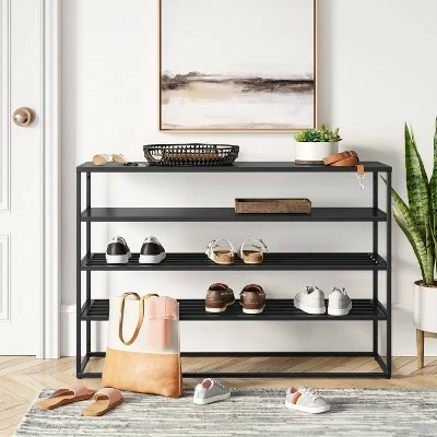 Keep your footwear organized with this Glasgow Metal Shoe Storage Console Table from Project 62â„¢. This black shoe storage rack comes with three shelves to offer ample space for your footwear. Built in a rectangle shape, this metal shoe storage table easily fits along your entryway wall.
