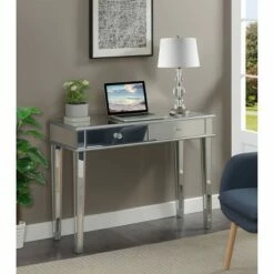 Glam up your home furnishings with the Gold Coast Deluxe 2 Drawer Mirrored Desk/Console Table by Breighton Home. This chic and sleek desk will bring any room to life with its luxurious glass mirrored panels. Two spacious pull-out drawers on roller slides reveal plenty of room for concealed storage. Stylish crystal faux drawer knobs offer easy accessibility to your home essentials. Constructed from MDF and glass mirrors, this desk is built to last. Beautiful silver non-lead-based paint surrounds the mirrored frame which gives this carefully crafted unit just the right amount of sparkle. This piece offers much versatility and can be utilized as a desk, console table, or vanity. Add additional glam throughout your home from the Gold Coast Collection by Breighton Home, each sold separately.