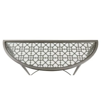 Elegant yet understated, this demilune sofa table from the Harding collection features a lovely silver finish. Perfectly suited for a contemporary style living room, this sofa table offers an airy tempered glass top that allows the light from a lamp to cast a wide illumination. Place this table behind your sofa to lend a place to set refreshments and keep handheld devices close at hand.