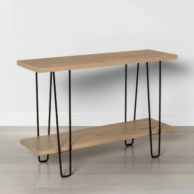 From accenting your entryway to providing a perfect spot to showcase your unique decor, this Wood & Wire Console Table from Hearth & Hand™ with Magnolia makes the perfect functional pick. Featuring a rectangular wood top and black-finished hairpin style legs, this eye-catching piece lends a touch of effortless sophistication to any room. Complete with a bottom shelf for additional storage, you’ll have plenty of space to showcase your favorite items from books to plants to pictures and more.