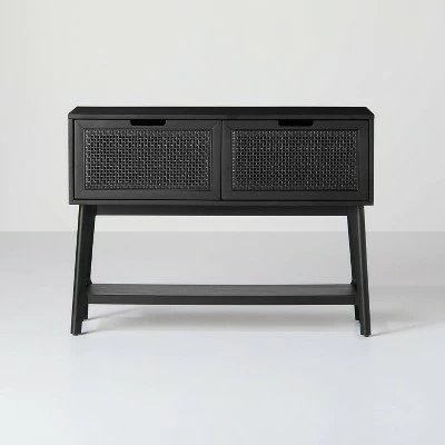 Add functional style in your entryway, living room or other area of your home with the Wood & Cane Console Table with Pull-Down Drawers from Hearth & Hand™ with Magnolia. Crafted from solid wood, this rectangular console table features a clean-lined silhouette in a solid black finish that blends easily with a range of different palettes and decor styles. The cane accented pull-down drawers provide plenty of room for storage, while its bottom shelf offers storage for tucking extra items out of the way. Stage it in the hall or behind the living room sofa with your favorite decorative items, greenery and family photos to bring your personal touch.