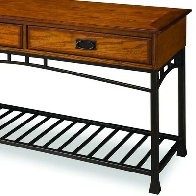 Capture a little of that arts and crafts style with this Homestyles Modern Craftsman Sofa Table. The solid poplar hardwood and veneer frame sits atop a decorative metal foundation for a desirable mixed materials look. The durable construction of both the metal frame and the wood top make this a truly timeless addition to any room your home.