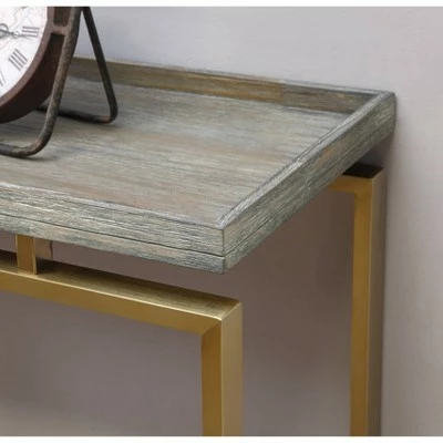 Behind your sofa with a pair of lamps, or against a wall showcasing your collection of rare Mayan artifacts, our Biscayne Collection console table is a choice selection. The wood top has a rustic Bicayne Weathered finish and a raised edge all around, and with the appearance of floating above the golden linear metal base, an ideal selection alone or when used with the matching cocktail and end tables.
