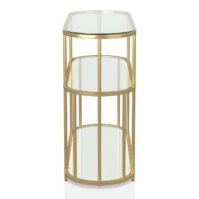 A mix of glass and steel come together with a radiant effect to transform any modern living space in this stunning contemporary console table. The steel frame is fashioned in a lustrous gold coated finish, while each of the top and shelves features tempered glass. The rounded edges of each tier combine with the multiple sleek supports to add a refined element to the overall design.