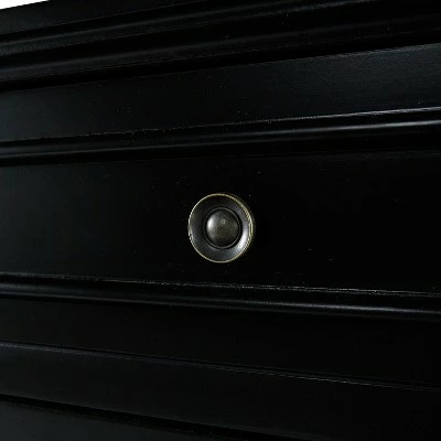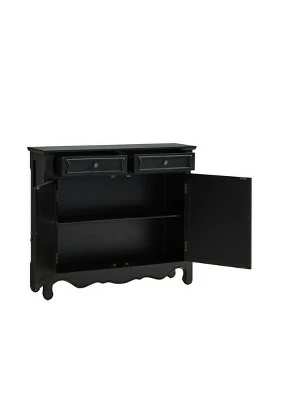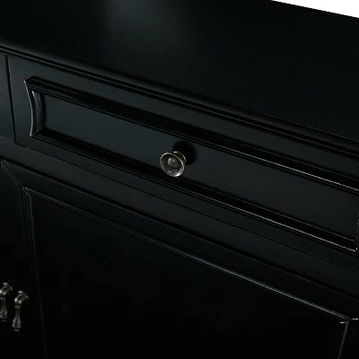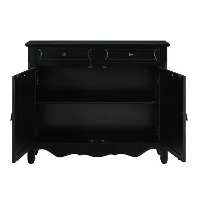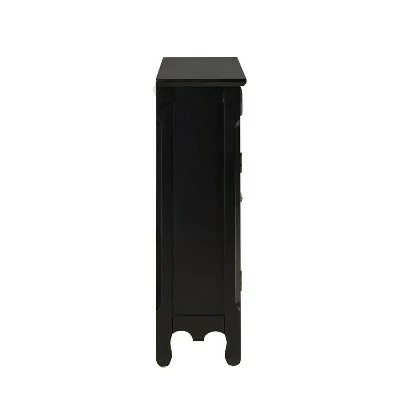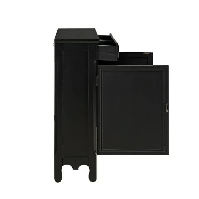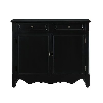 The Black Console has a sleek and simple design. The decorative curved bottom adds an extra touch of drama to the piece while the black finish is sure to fit into any home décor. The console opens with two doors to reveal storage space with interior, fixed shelf. This is the perfect piece to add to any entryway, hall, bedroom or living area. Fully Assembled. This console is easy to maintain, simply spot or wipe clean as needed.