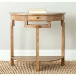A handsome demilune table for an entry hall or living room wall, the Liana console is transitional with an industrial chic edge. Crafted of elm wood in an oak finish, Liana has a handy drawer and lower shelf for magazines or accessories. Care Instructions: Dust regularly with a soft, dry cloth. Never use oiled or treated cloths on lacquered finishes. Some finishes can be wiped with a damp (not wet) cloth, followed at once by rubbing with a dry cloth to remove fingerprints and smudges. For persistent spots, gently clean with a soft cloth and a solution of water and mild soap, make sure to wipe dry. Use adhesive felt pads, coasters and placemats to protect your furniture.