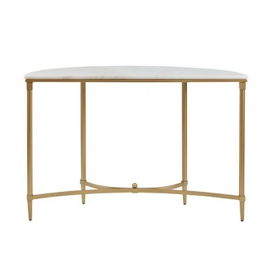 The Bordeaux Console Table transforms your living room with its sophisticated traditional style. Flaunting a high-class look, this round end table showcases a white marble table top with beautifully coordinating gold metal legs. Slip this elegant end table into your living room or home office to bring a glamorous allure to your decor. Assembly is required.