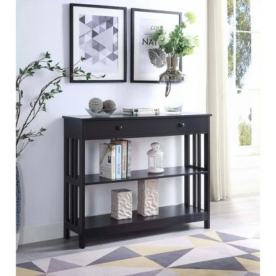 Instantly optimize your storage and display space by bringing home the Mission 1 Drawer Console Table with Shelves by Breighton Home. Offers three ample shelves, enough for all your beloved mementos and one drawer for those unsightly essentials. The drawer is accompanied by roller style metal drawer slides, to help you open and close the drawer smoothly. Do not forget about the signature style side frames, they give this piece its sleek look and contemporary style. Crafted from MDF and finished in a non lead based paint, this accent unit was built for durability. Add to your entryway, hall or living room and enjoy its endless versatility. Allow this furniture to become a staple in your home right after delivery with its simple 9 step assembly. This multifunctional table is available in multiple finishes. Pair with more items from the Mission Collection by Breighton Home. Each sold separately.