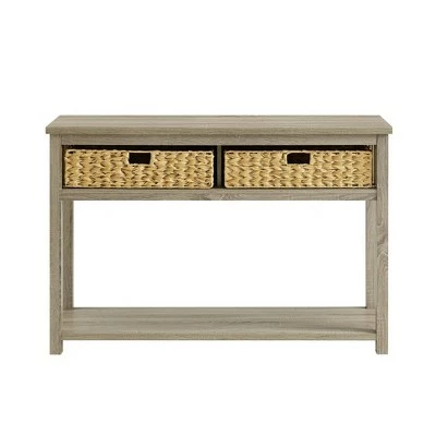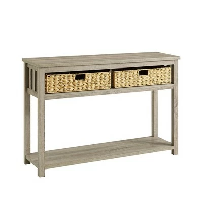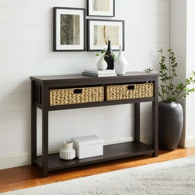 Saracina Home’s Mission Entry Table with Woven Baskets is not just a table, but a timeless first impression. The bold wood side details accentuate a classic, transitional style that will impress your guests as they walk through your door. Stylishly store mail, keys, or knick-knacks in the two faux-rattan wicker baskets. The lower shelf is the perfect spot for extra shoes or seasonal décor. Pair with Saracina Home’s matching coffee and side tables to spread this style throughout your home.
