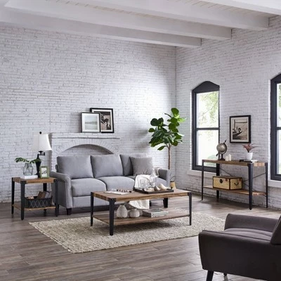 - Features a modern rustic industrial design with tapered metal legs, visible nail heads and surface areas in a weathered wood finish