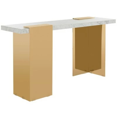 Inspired by the luxurious texture and form of iconic modern sculpture, this marble console table is a substantial focal point in any living room or hall. Its bold brass foundation supports a timeless white marble top with natural raw edges. A new classic.