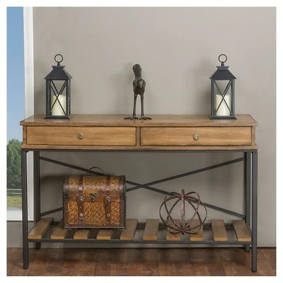 Stark rustic styling plus plenty of surface and storage space combine in our Newcastle Wood and Metal Console Table—Criss Cross. This table’s vintage industrial design is achieved via black metal finishing and distressed ash veneer. Decorative metal X stretchers and xylophone-like slats add up to superior styling at a discount-furniture price tag. Two drawers provide lots of storage. Sturdy construction ensures years of use. Dimensions: 30″ High x 47.25″ Wide x 18″ Long; Drawer: 3.1″ High x 20.5″ Wide x 10.5″ Deep; Shelf: 17.1″ High x 45″ Wide x 17.2″ Deep
