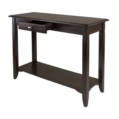 The chic and durable Winsome Wood Nolan End Table fits easily into a variety of spaces, offering an attractive and functional spot for storage and accessories. Use it in an entryway, next to a sofa or bed or anywhere you need a smooth surface and handy shelf. The rich cappuccino finish is classic and works well in just about any room. Tapered legs with ribbed accents look elegant and are sturdy. Beveled edges add sophisticated detail. Use the lower table for storing things such as books, crafts and knick-knacks. The top surface is the ideal height to set a glass, a lamp or other items you’d like nearby. Coordinate it with other furnishings from the Nolan line for a cohesive look throughout your home. Constructed of solid wood and composite. This table is conveniently packed and shipped in 1 box with little assembly required. Replacement parts can be requested directly to the manufacturer within 60 days from date of purchase.