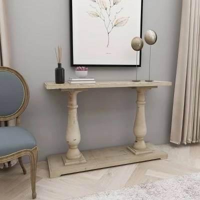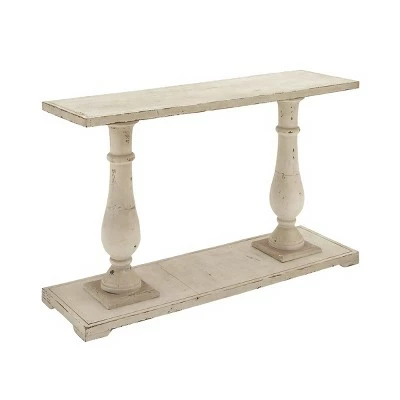 - This farmhouse style inspired white Chinese fir wood console table features 2 pillar columns as legs attached to a rectangular base with a slight elevation
