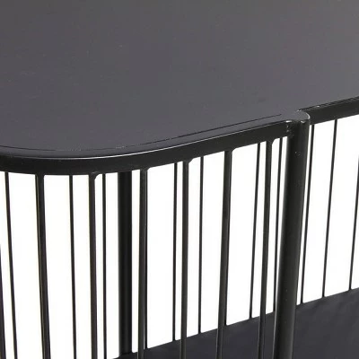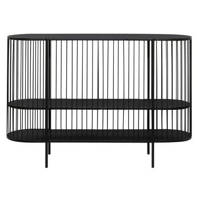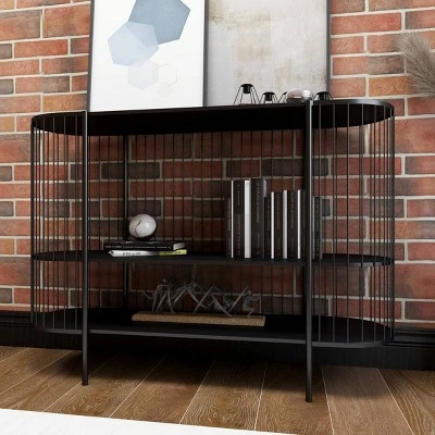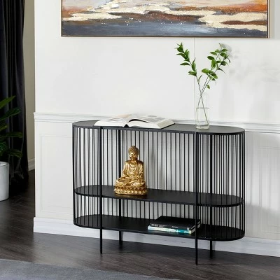 - This oval-shaped metal console table features a polished black iron finish