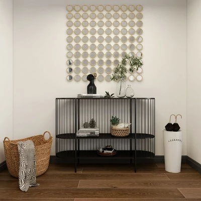 This metal frame console table is ideal for modern, contemporary, and eclectic-themed living spaces. Bring a finishing touch to your home with an inviting appeal with this console table. A sturdy and long lasting construction that for a years of enjoyment. Designed with rubber stoppers at the base that prevent scratching furniture and table tops, as well as sliding around. Suitable for indoor use only. Item has maximum weight limit of 100 lbs. Item features 2 oval-shaped metal shelves with a weight capacity of 30 lbs. Contemporary design.