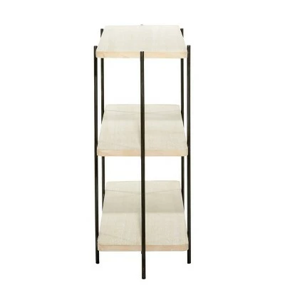- A 3-tier console table that sports light beige wooden shelves with black metal foundation on both sides