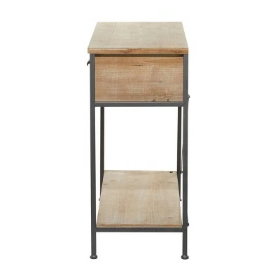 - This narrow console table features a naturally textured wooden table top with 3 drawers and geometric-styled iron legs