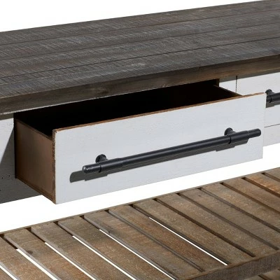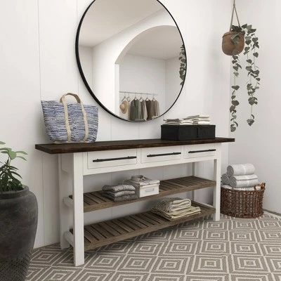 Display as decorative and functional console table in your boho, country, or cottage-themed home space. Bring a finishing touch to your home with an inviting appeal with this console table. A sturdy and long lasting construction that for a years of enjoyment. A rectangular console table with 3 pull-out drawers measuring 16″L x 13″W. Suitable for indoor use only. Maximum weight limit is 100 lbs., each drawer can hold up to 25 lbs., each shelf can hold up to 30 lbs. This console table features lower shelves for extra storage. Farmhouse-themed style.